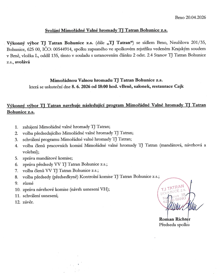 Oznámení o konání VALNÉ HROMADY TJ Tatran Bohunice z.s.